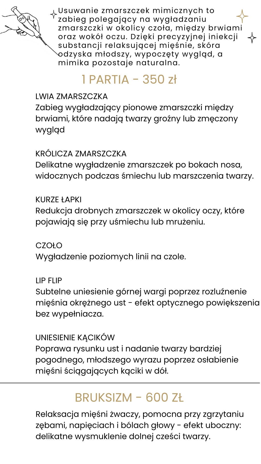 Specjalizuję się w nowoczesnych zabiegach, takich jak powiększanie ust, wolumetria twarzy czy usuwanie zmarszczek – wszystko po to, by delikatnie podkreślić Twoje atuty i zachować świeżość oraz młodzieńczy wygląd na dłużej.